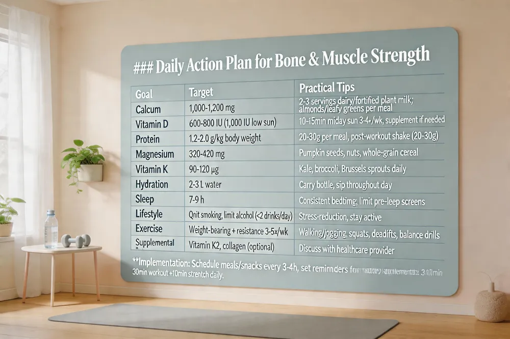 | Supplemental Support | Vitamin K2, collagen (optional) | Discuss with healthcare provider if diet is insufficient |