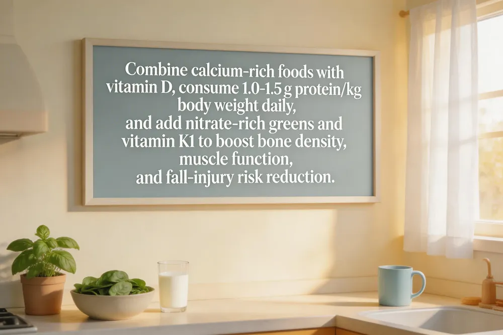 Adequate nutrition is a cornerstone of musculoskeletal health, supplying the minerals, proteins, and vitamins needed for strong bones, resilient muscles, and lubricated joints. Calcium and vitamin D work synergistically; vitamin D enhances calcium absorption and together they support bone mineral density, muscle function, and fall‑injury risk reduction. Adults require 1.0‑1.5 g protein/kg body weight daily to preserve lean mass and bone health, especially when combined with resistance exercise. Vegetable nutrients add further protection: dietary nitrate from leafy greens and beetroot improves muscle contractile efficiency, while vitamin K1 (phylloquinone) from cruciferous and leafy vegetables promotes osteocalcin carboxylation, lowering fall and hip‑fracture risk.