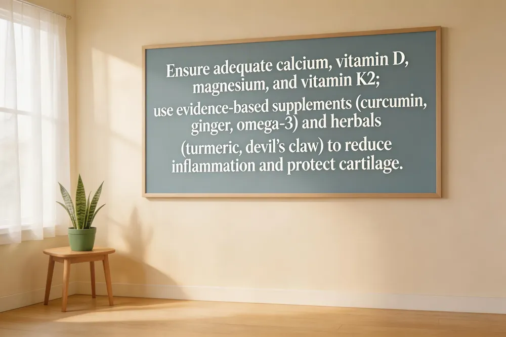 Adequate calcium, vitamin D, and magnesium are foundational for bone matrix formation and muscle relaxation. Vitamin K2 (phylloquinone) activates γ‑carboxylation of osteocalcin, directing calcium into bone and preventing deposition in soft tissues, thereby enhancing bone density and joint stability. A balanced multivitamin that includes vitamin C for collagen synthesis further protects cartilage.