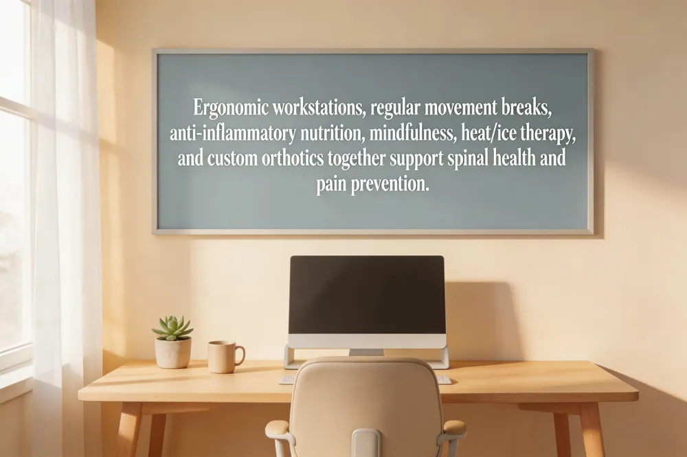 Mind‑body stress reduction and anti‑inflammatory nutrition go hand‑in‑hand. Incorporate daily mindfulness meditation or deep‑breathing to lower cortisol‑driven muscle tension. Eat a diet rich in omega‑3 fatty acids, leafy greens, turmeric, and ginger; stay hydrated and maintain a healthy weight to lessen mechanical load on the spine.