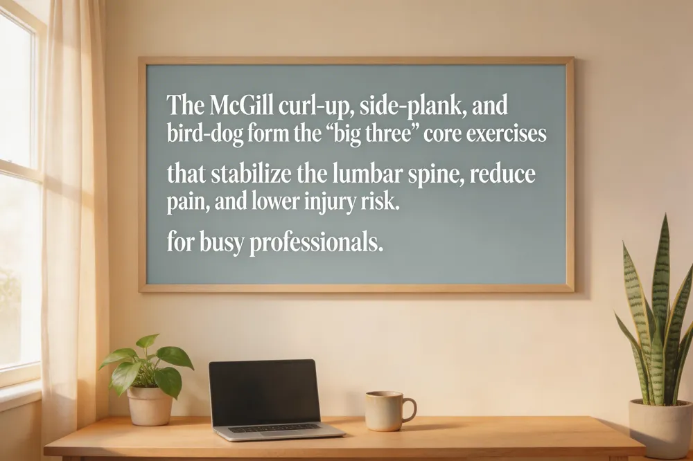 The “big three” core exercises for lower‑back pain are the McGill curl‑up, side‑plank, and bird‑dog. These movements target deep stabilizing muscles—such as the transverse abdominis, obliques, and lumbar erector spinae—while keeping spinal flexion and extension to a minimum, which protects the lumbar spine from excessive shear forces. By enhancing spinal stability, they reduce pain intensity and lower the risk of future injury. In a personalized rehabilitation plan for busy professionals, a chiropractor like Dr. Allison Ross, DC, first conducts a detailed assessment to identify each patient’s specific triggers and biomechanical deficits. Then she integrates the “big three” into a concise, home‑based program (e.g., 10‑minute daily sessions) combined with ergonomic education, corrective exercises, and adjunct therapies such as myofascial release or cold laser therapy. This multimodal, patient‑focused approach not only improves core strength but also aligns with the individualized, drug‑free treatment strategies proven to reduce back‑pain episodes by up to 40‑% in office workers.