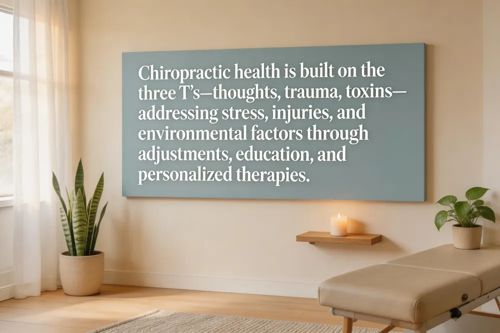 The three T’s—thoughts, trauma, and toxins—form the foundational model for chiropractic health. Thoughts encompass chronic stress and negative mental patterns that disrupt hormonal balance and nervous‑system function. Trauma includes both acute injuries (e.g., car accidents, falls) and repetitive micro‑trauma from poor posture or over‑use common to busy professionals. Toxins cover dietary irritants, environmental pollutants, and other harmful substances that inflame the body and hinder nerve performance.