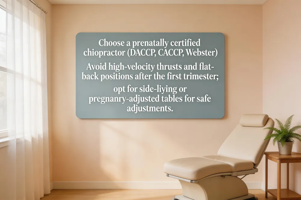 Choose a chiropractor who holds prenatal designations such as DACCP, CACCP, or Webster Certified. Do not receive deep‑pressure or high‑velocity thrusts that target the abdomen or uterus. Avoid lying flat on your back on a standard table after the first trimester; request a side‑lying or pregnancy‑adjusted table. Skip techniques that place excessive strain on the pelvis or ligamentous structures, and refrain from untested modalities that lack safety data for pregnancy.