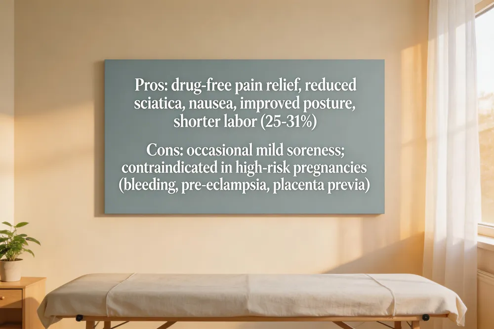 Cons: While generally safe, a small minority may feel mild soreness after an adjustment. Care must be avoided in high‑risk situations such as unexplained vaginal bleeding, pre‑eclampsia, placenta previa, or imminent labor. The benefits outweigh these minimal risks when treatment is provided by a chiropractor with prenatal training (e.g., DACCP, CACCP, Webster Certified).