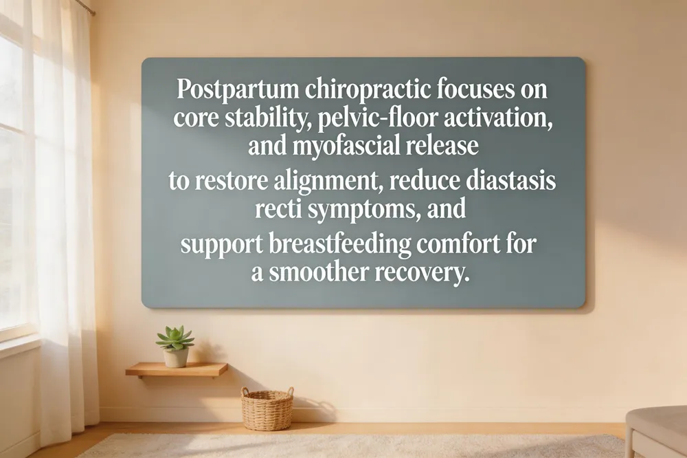 Postpartum chiropractic care continues the focus on alignment, but the goals shift to recovery from labor, re‑establishing core stability, and relieving lingering pelvic or back pain. Gentle, low‑force adjustments combined with myofascial release, supportive orthotics, and prescribed exercises help restore spinal biomechanics, reduce diastasis recti symptoms, and improve breastfeeding posture. Research indicates that women who receive regular postpartum visits experience faster return to normal mobility and lower rates of chronic low‑back pain.
