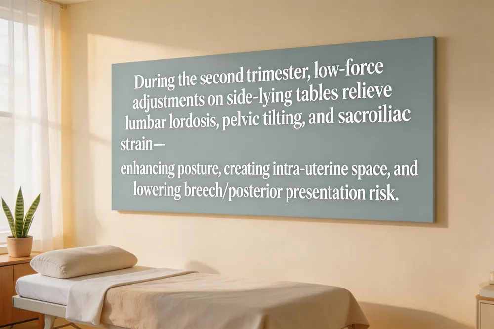 The second trimester is often the most comfortable period for prenatal chiropractic care, and it remains safe when the chiropractor is trained in pregnancy‑specific techniques such as DACCP, CACCP, or Webster Certification. Using a specially designed, side‑lying table or a drop‑piece, the practitioner delivers low‑force, gentle adjustments that respect the growing abdomen. These adjustments target the increased lumbar lordosis, pelvic tilting, and sacroiliac strain that commonly arise as the uterus expands. By restoring spinal and pelvic alignment, the chiropractor reduces back, neck, and joint pain, improves posture, and creates more intrauterine space. The Webster Technique or similar pelvic‑balancing methods are frequently employed to relieve uterine tension, promote optimal fetal positioning, and lower the risk of breech or posterior presentations. Regular visits—typically once a month or as needed—allow ongoing monitoring, safe stretching, and core‑strengthening exercises that support maternal mobility and may shorten labor duration.