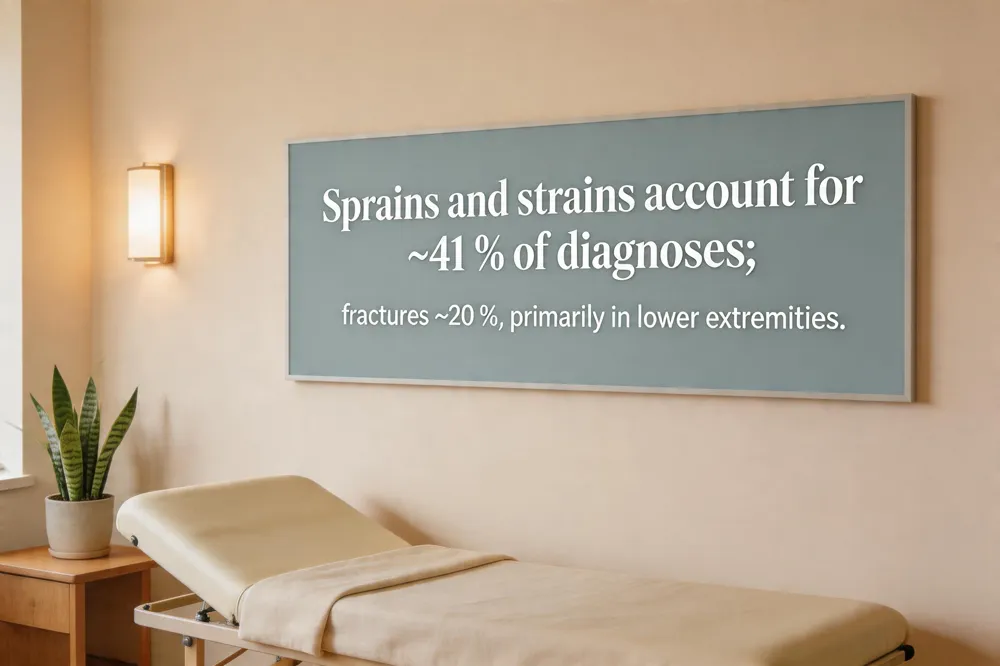 - Sprains and strains make up about 41 % of all sports‑injury diagnoses.