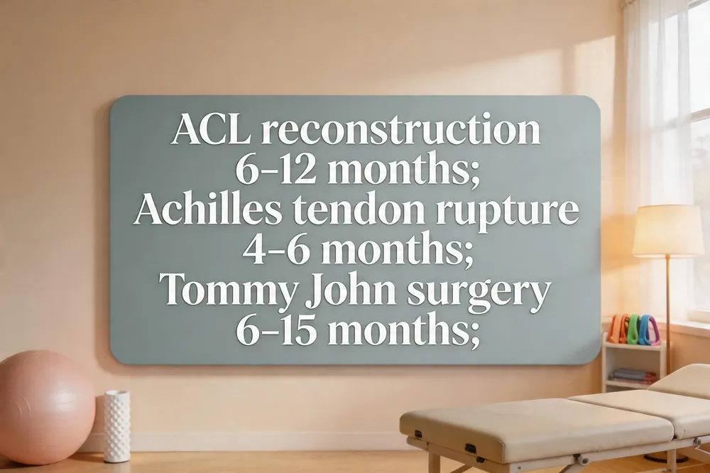 - Tommy John (UCL) surgery recovery ranges from 6 to 15 months, depending on sport and position.