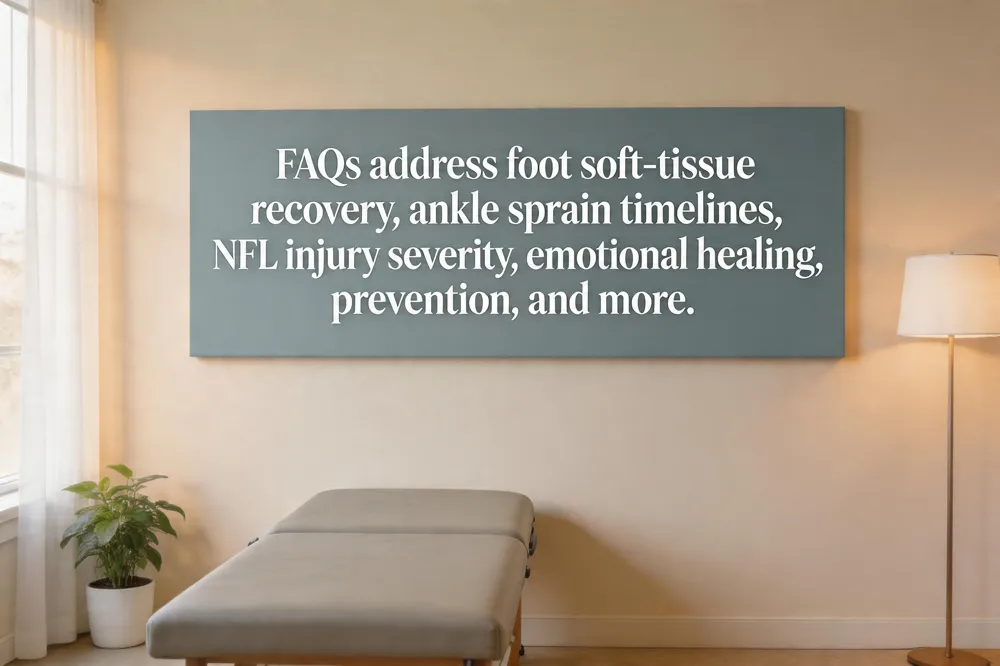 Foot soft‑tissue injuries such as sprains typically need about 6–12 weeks for the damaged ligaments and surrounding tissues to heal sufficiently for normal activities. Early weight‑bearing and gentle range‑of‑motion exercises are encouraged, while a boot or crutches are used only for comfort during the first couple of weeks. Swelling and mild discomfort may linger for several months, often up to 6–12 months as the foot regains full strength and endurance. High‑impact activities (running, jumping, dancing) should be avoided for at least three months to prevent re‑injury. If significant pain, swelling, or stiffness persist beyond six weeks, a follow‑up evaluation is advisable.