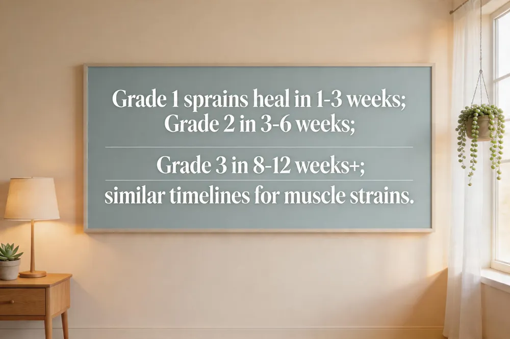 - Ankle sprain recovery timelines: Grade 1 = 1‑3 weeks, Grade 2 = 3‑6 weeks, Grade 3 = 8‑12 weeks or longer.
