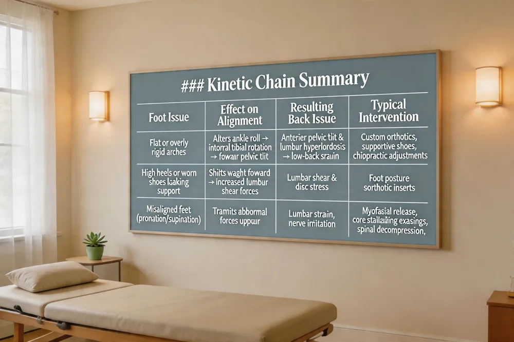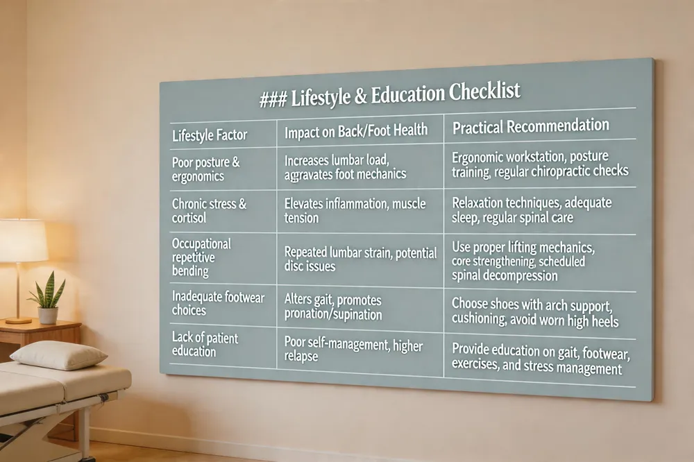 | Poor posture & ergonomics | Increases lumbar load, aggravates foot mechanics | Ergonomic workstation, posture training, regular chiropractic checks |