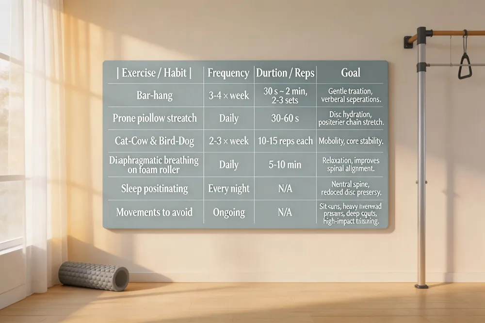 Everyday exercises that mimic decompression: Simple at‑home moves include the prone pillow stretch (face‑down with a pillow under the pelvis for 30‑60 seconds), side‑lying stretch off a couch edge, cat‑cow mobility drills, bird‑dog lifts, and diaphragmatic breathing on a foam roller. A brief bar‑hang (10‑30 seconds) adds a powerful traction effect. Perform these regularly to improve posture and spinal mobility.