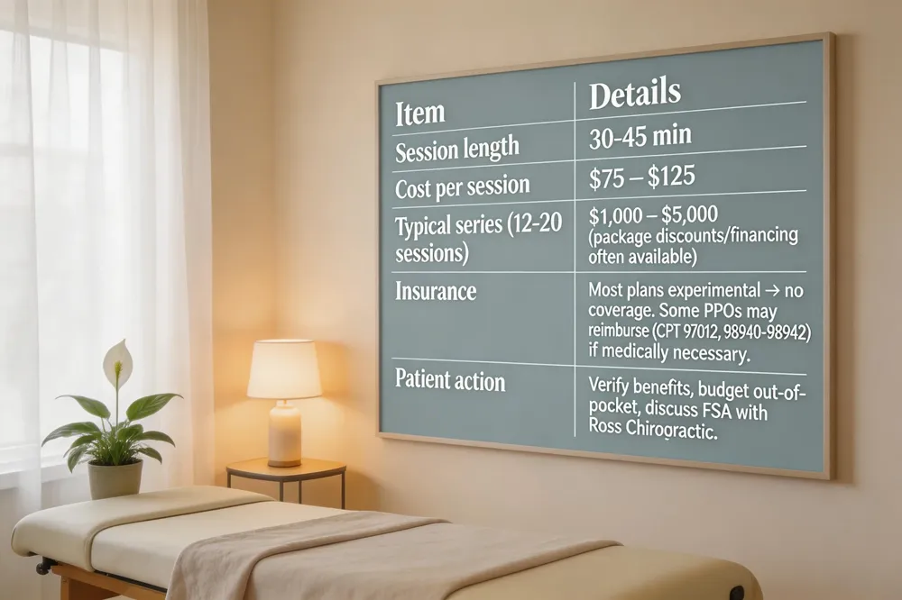 Spinal decompression therapy costs typically range from $75 to $125 per 30‑45‑minute session. A full series of 12‑20 sessions therefore totals $1,000‑$5,000, with many clinics offering package discounts or financing plans. At Ross Chiropractic we tailor pricing packages and can discuss flexible‑spending‑account options.