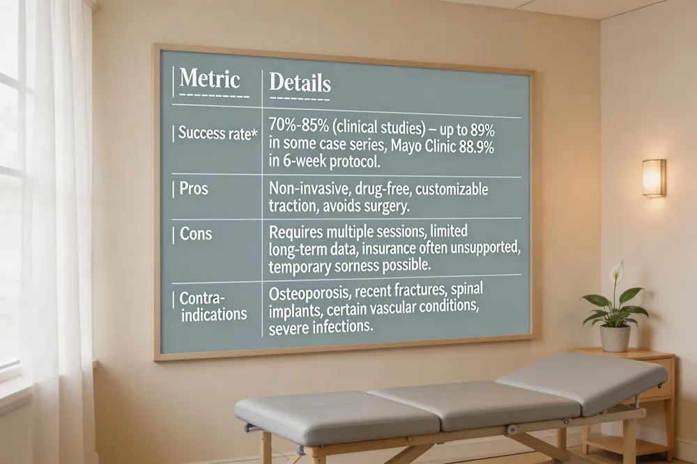 Cons and contraindications include the need for multiple sessions over several weeks before noticeable relief, limited long‑term efficacy data, and exclusions for patients with osteoporosis, recent fractures, spinal implants, certain vascular conditions, or severe infections. Insurance coverage can be inconsistent, and some individuals may experience temporary soreness or a brief increase in discomfort during or after treatment.