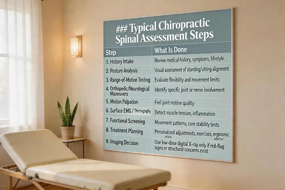 The visit begins with a thorough health history, followed by posture analysis, range‑of‑motion testing, and orthopedic and neurological maneuvers. Chiropractors may use motion palpation, surface EMG, or thermography to detect joint restrictions, muscle tension, and nerve involvement. Findings guide personalized, non‑invasive treatment plans and determine if imaging is necessary.