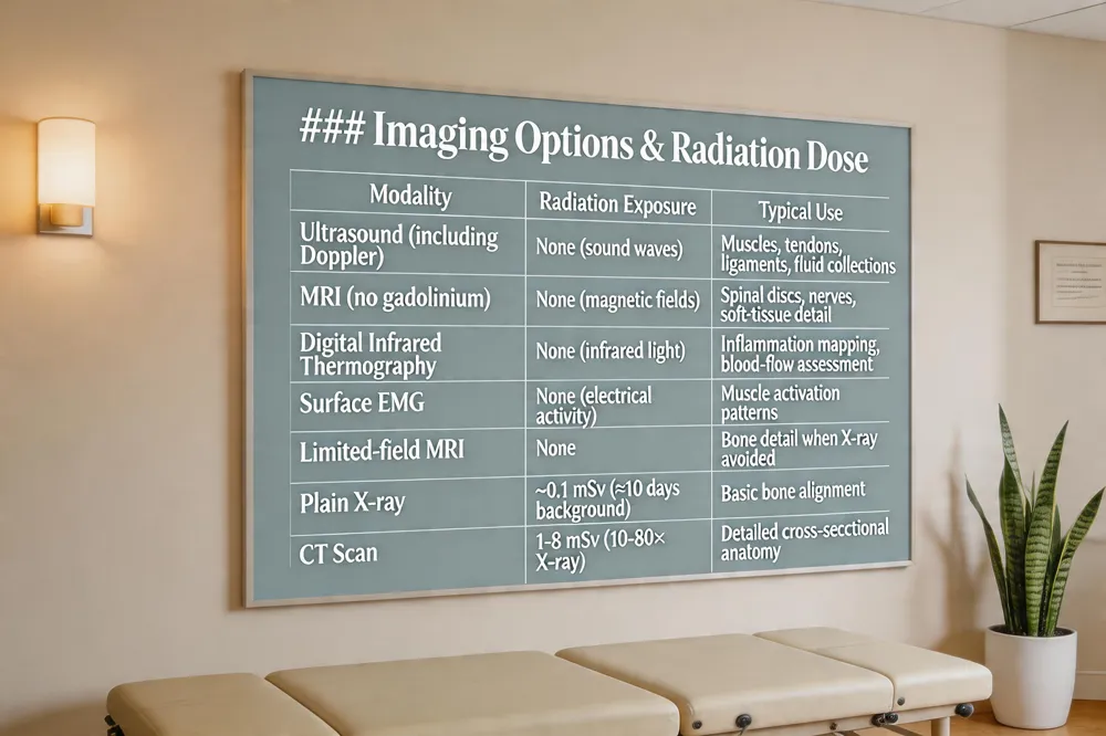 Beyond pregnancy, a range of non‑radiation diagnostics are available. MRI and diagnostic use magnetic fields and high‑frequency sound waves, respectively, to image bone, joints and soft tissues without ionizing radiation. Digital infrared thermography maps skin temperature patterns, highlighting inflammation or altered blood flow without any exposure. Functional movement screening, thorough clinical examinations, and tools such as surface electromyography (sEMG) and posture analysis provide valuable biomechanical information without imaging at all.