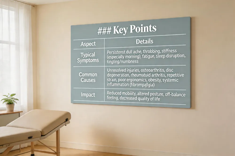 | Typical Symptoms | Persistent dull ache, throbbing, stiffness (especially morning), fatigue, sleep disruption, tingling/numbness |