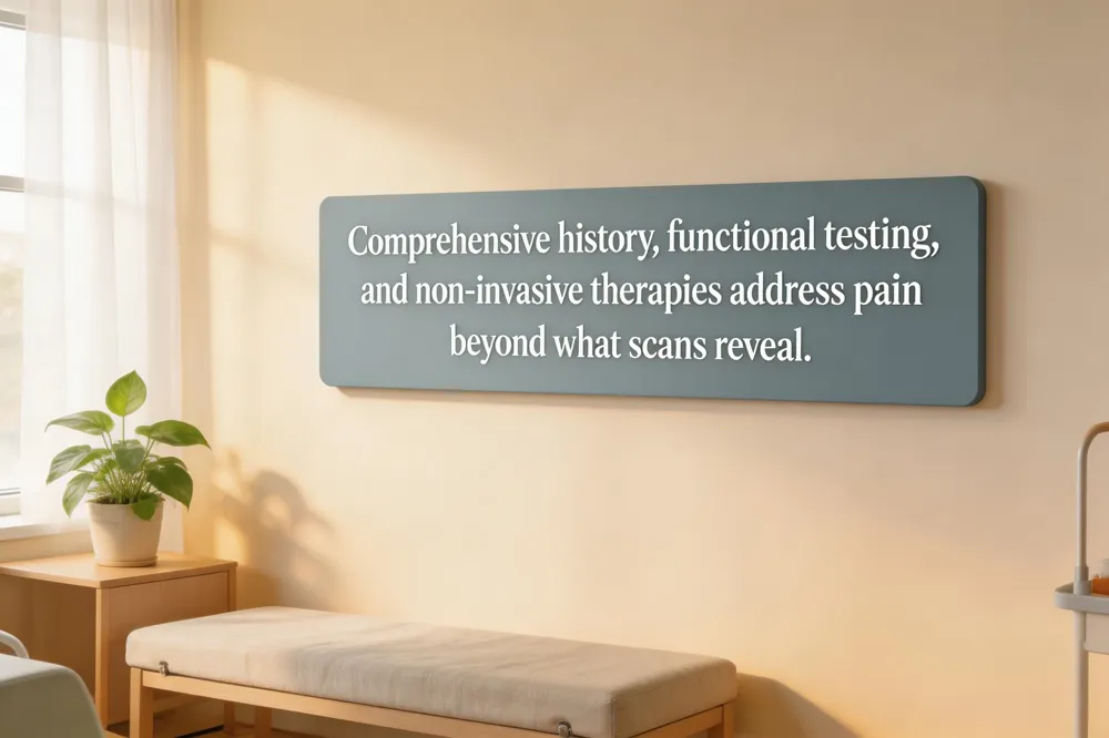 Pain is a brain‑generated experience that integrates past injuries, stress, sleep, beliefs and nervous‑system sensitivity, not merely tissue damage. Imaging modalities—X‑ray, MRI, CT—show bones, discs and joints but cannot reveal nervous‑system sensitization, muscle tension, fascial restrictions, central sensitization or psychosocial factors that drive pain. Because structural findings such as disc bulges or arthritis appear in up to 97 % of asymptomatic adults, they often do not explain symptoms. A holistic assessment that combines detailed history, movement testing, functional screening and patient‑reported outcomes provides the information needed to identify true pain generators and guide non‑invasive, movement‑focused care and improve long‑term function outcomes.