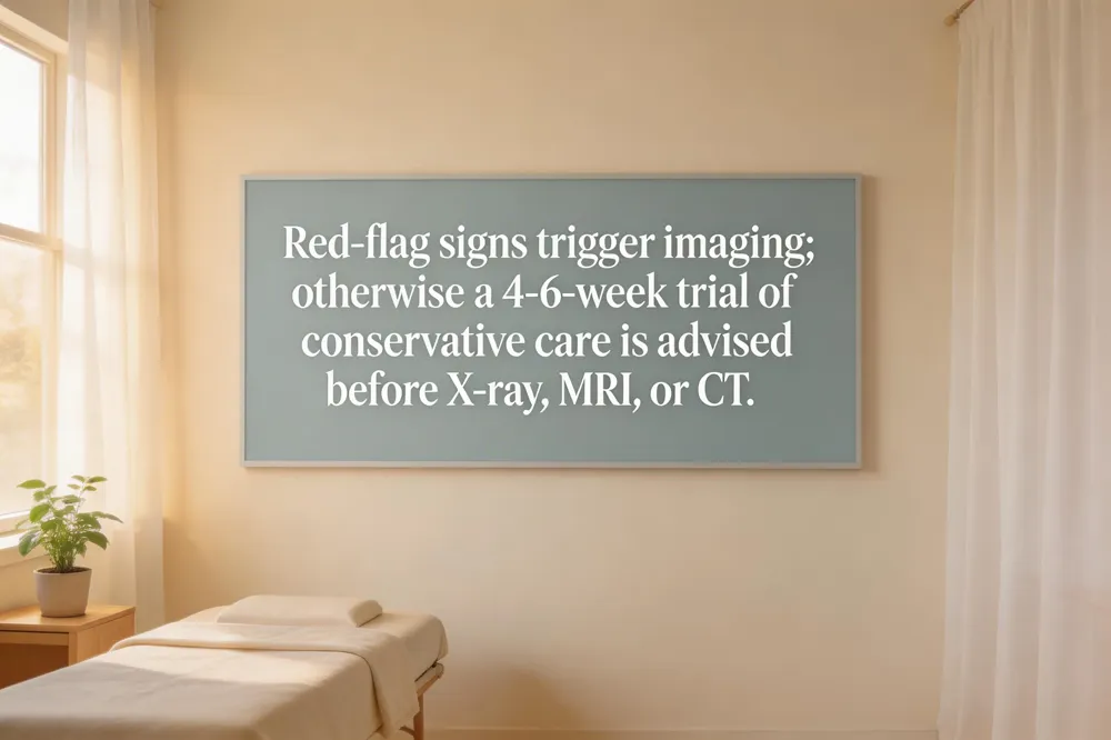 Red‑flag signs (severe or progressive neurologic deficits, bowel/bladder dysfunction, unexplained weight loss, fever, recent trauma, cancer history, infection, osteoporosis‑related fracture, cauda‑equina syndrome) trigger imaging. Guidelines from Choosing Wisely, AANS/ACEP, and the ACR advise against routine imaging for acute low back pain within the first six weeks unless such red flags appear. In those cases a plain‑film X‑ray is usually the first step to assess bony alignment or fracture; MRI is reserved for soft‑tissue, disc, or nerve‑root evaluation, and CT when detailed bone imaging is needed. For most patients (90‑95 % non‑specific) a trial of conservative, non‑invasive care—education, activity modification, physical therapy, chiropractic adjustments, myofascial release—should proceed for at least four to six weeks before any advanced imaging. MRI is ordered only after persistent symptoms despite appropriate treatment or when surgical planning is considered.