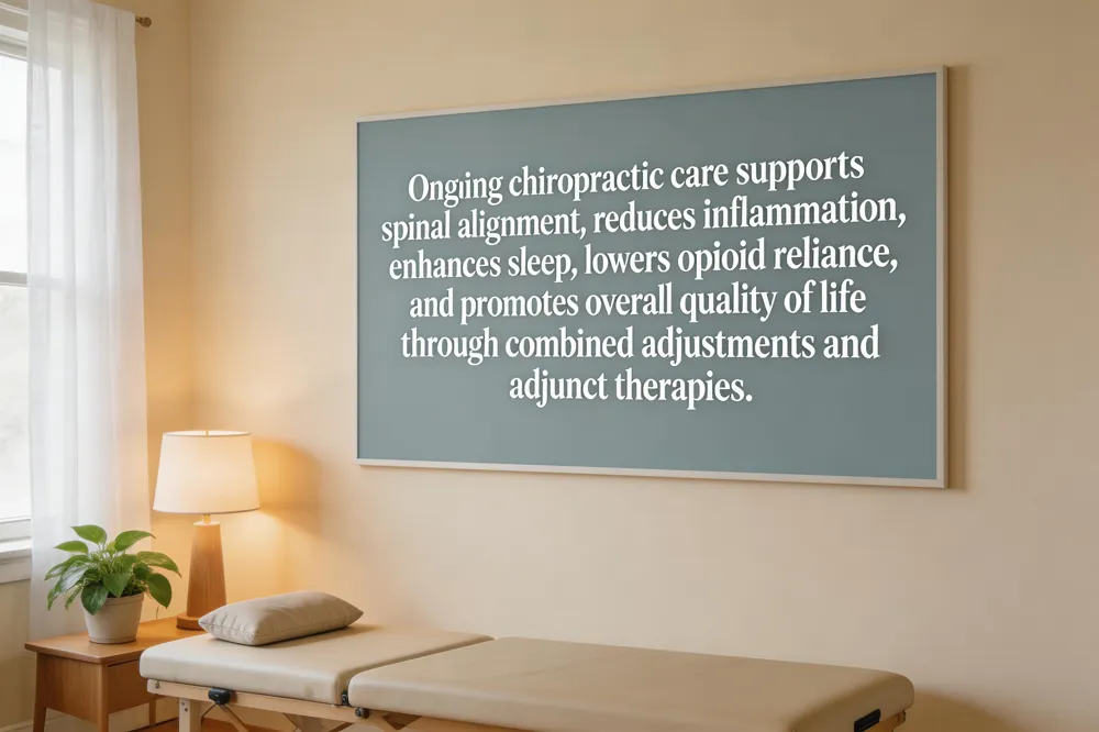 Long‑term benefits of chiropractic care? Sustained spinal alignment, reduced chronic pain, enhanced mobility, better sleep, and a lower risk of surgery or medication dependence.