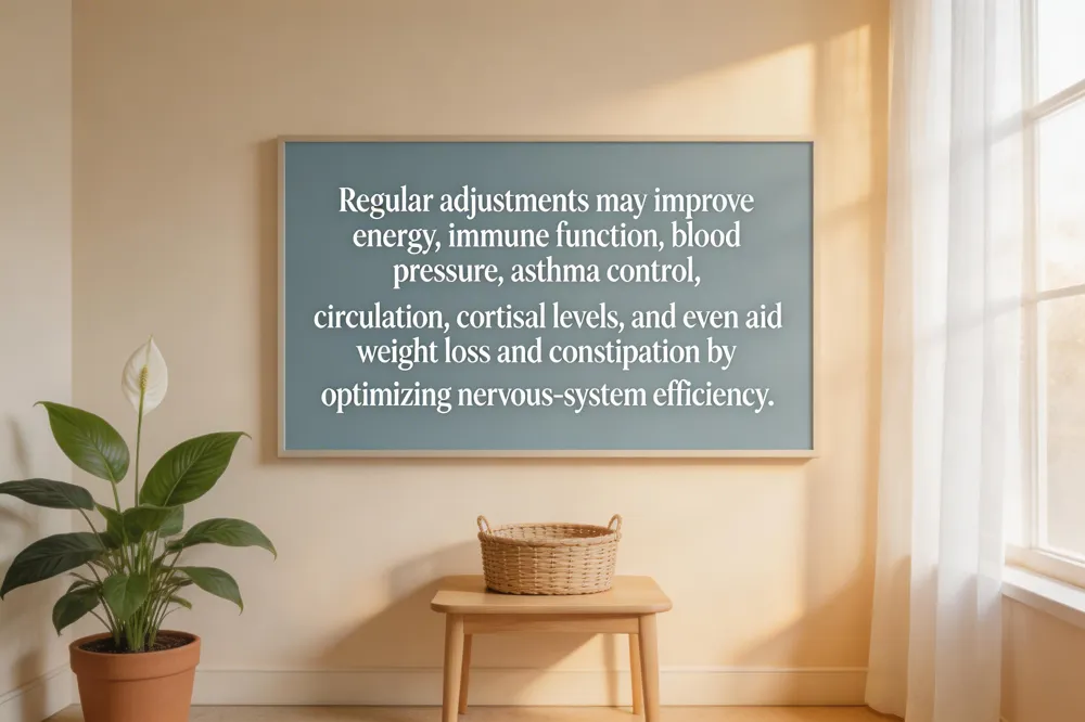 Regular adjustments relieve joint and muscle tension, allowing the nervous system to work efficiently. This boosts energy and supports immune function by reducing nerve interference. Proper spinal alignment is linked to lower blood pressure and better asthma control, showing cardiovascular benefits.