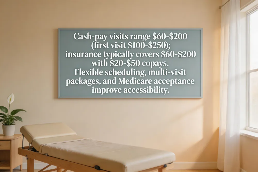 Most plans cover $60‑$200 per visit, with a usual co‑pay of $20‑$50 after the insurer’s negotiated rate. The initial evaluation is $120‑$180; subsequent adjustments are billed at the standard per‑session rate. Coverage varies by state and plan, so verify details with the clinic’s billing staff.