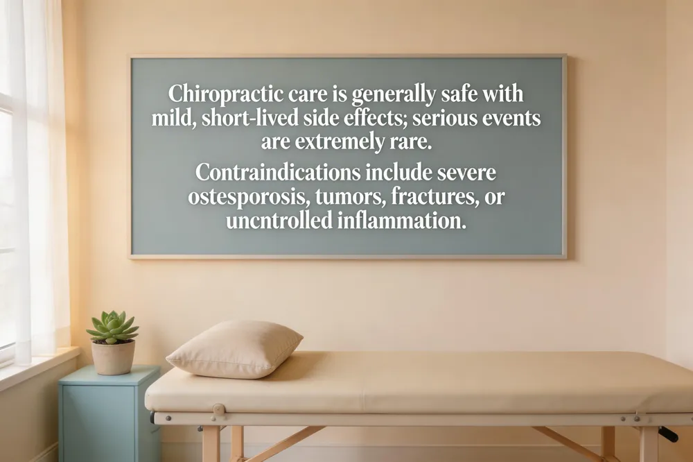 Preventive chiropractic care is generally safe when performed by a licensed, well‑trained practitioner. Most patients report only mild, short‑lived reactions such as muscle soreness, stiffness, or a brief headache that resolves within a day or two. Rare serious events—like vertebral‑artery dissection or stroke—occur in fewer than one in several million high‑velocity neck adjustments, and are more likely in individuals with underlying vascular risk factors. Contraindications include severe osteoporosis, spinal tumors, acute fractures, or uncontrolled inflammatory disease; these conditions should be disclosed before treatment.
