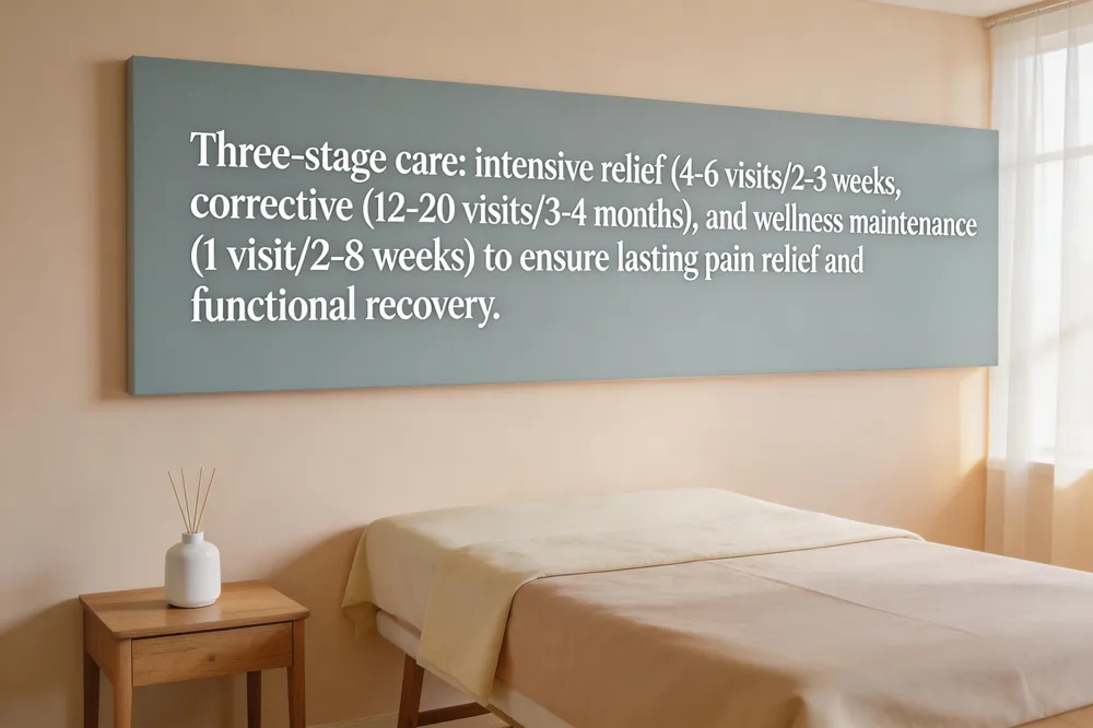 At Ross Chiropractic we view care as a three‑stage process. Intensive relief phase – most patients begin with 4‑6 appointments over the first two to three weeks to address acute back, neck or sciatica pain. Corrective phase – for chronic or structural issues we typically schedule 12‑20 visits across three to four months, combining adjustments with myofascial release, corrective exercises and custom orthotics to rebuild strength and alignment. Wellness maintenance – once the problem is resolved, a maintenance schedule of one visit every 2‑8 weeks (often bi‑weekly) helps preserve gains and prevent relapse.